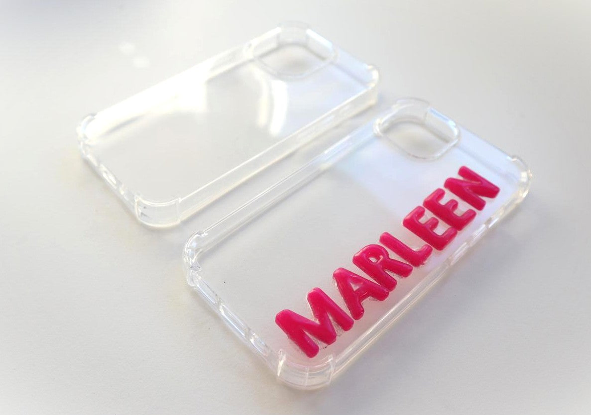 This personalised iPhone case is designed to make your phone truly yours. Choose transparant as the perfect base colour and add your name, initials, or any meaningful number up to 12 characters. Each letter is carefully placed by hand and sealed under a crystal-clear coating for a sleek, luxurious finish.
